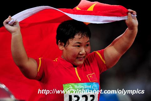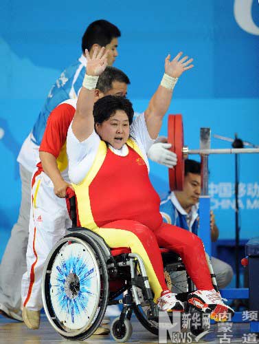 9月13日,中國選手邊建欣在頒獎儀式上。 當日,在北京2008年殘奧會女子60公斤級舉重比賽中,邊建欣兩次打破世界紀錄,最終以135公斤的成績奪得冠軍。 新華社記者楊磊攝
