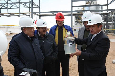 伊泰集團(tuán)總經(jīng)理張東海拿到手的這桶油,是我國(guó)完全自主知識(shí)產(chǎn)權(quán)的第一桶煤制油品。 韓雄亮 攝影