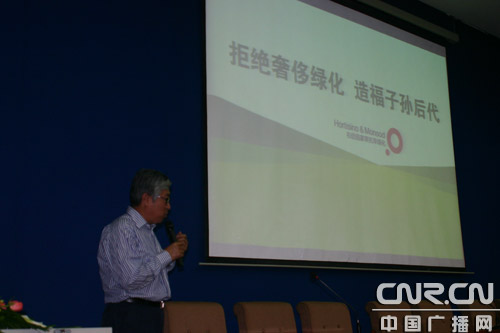 此次演講還請到了蒙牛乳業集團發起人之一、內蒙古和信園蒙草抗旱綠化有限公司副董事長孫先紅先生。孫先紅先生此次演講的主要內容是“蒙草”作為一支經濟實惠的抗旱綠化的“新軍”如何在全球環境惡化的大背景下尋求發展的機會和道路。演講中,孫先紅先生展示了外國以及中國現行的高耗能的綠化模式,通過和“蒙草”的節能降耗的綠化模式相比較得出結論,“蒙草”適合新時期的綠化模式要求,一定能在全國甚至全世界得到推廣和運用。
