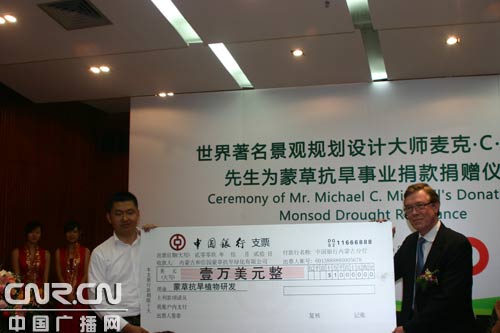 世界著名景觀設計師、MCM集團總裁麥克?米切爾先生也告訴記者,他正是看到了蒙草抗旱綠化事業將會對全球的環境和人類的長遠發展做出巨大貢獻,才決定向內蒙古和信園蒙草抗旱事業捐款一萬美金,并與該公司達成合作意向共同推進蒙草抗旱事業的發展。在米切爾先生捐款一萬美金的同時,內蒙古和信園蒙草抗旱綠化有限公司將這一萬美金轉為他的入股資金。