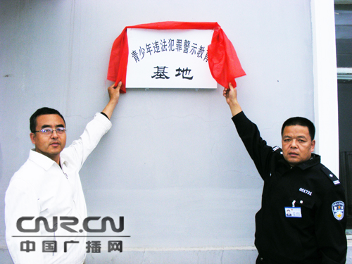 扎蘭屯市公安局監(jiān)管大隊與六中負責(zé)人為青少年違法犯罪警示教育基地揭匾