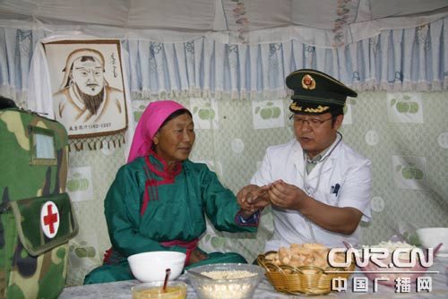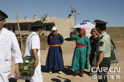 遇到小分隊不能解決的問題,郭純總要叮囑他們在不忙的時候一定要去內蒙古武警總隊醫院進行檢查,他更向那些生活比較貧困的牧民承諾,到時候一定免費為他們檢查。牧民朋友們總是拉著郭純院長的手一遍遍的說謝謝,還有一些牧民嘴里念叨著“賽額木其(蒙古語,漢譯為好大夫)”。在小分隊走的時候,牧民總是送了一程又一程。