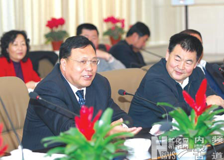 1月21日,自治區黨委副書記岳福洪(左)與出席自治區十一屆人大一次會議的巴彥淖爾市代表審議政府工作報告。群英攝