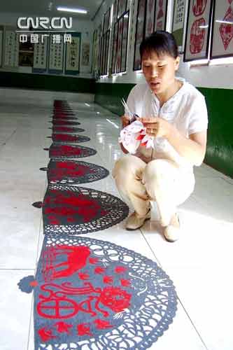 41歲的都葉梅從小酷愛剪紙藝術,她7歲學習剪紙,30多年來,一直都沒有停止過對剪紙藝術的追求。她苦心研究傳統剪紙藝術,并大膽創新。她的剪紙優美、傳神,粗中有細、巧中藏拙,簡練而不粗陋,細膩而無媚俗。在她一剪一刀下,都能刻畫出一個個可親、可愛、活生生的藝術形象,從而達到了老少皆宜,雅俗共賞的新境界,因此她剪出了許多深受群眾喜愛的作品。隨著都葉梅剪紙藝術日臻成熟,她的名字不脛而走,其作品頻頻見諸報刊,至今已有一百多幅作品被國內外友人或美術館收藏,有些作品飄洋過海,到德、法、日、俄等國家參展。
