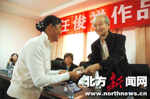 內蒙古師范大學教授李淑章將2000元錢交給鄂爾多斯市烏審旗農民任俊祥,贊助她出版詩集。 (攝影 王磊)
