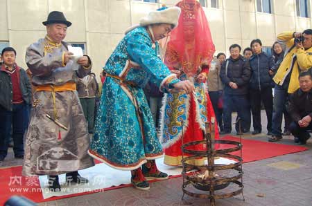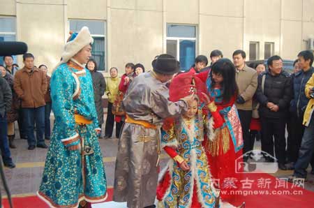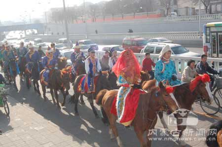 內蒙古教育出版社的蒙古族小伙子洪格爾把自己的新娘用馬隊接回家。這在現代大都市里形成了一個對比的場景,因此也吸引了很多人的關注。騎馬接親是蒙古族古老的結婚儀式,在很多人的記憶中已消失的無影無蹤,有些人為了把這個民族傳統的文化保留下來,曾經拍過電影、拍過紀錄片、編過舞蹈劇,可效果都不是很好。 12月7日,這個吉祥的日子,這對恩愛的年輕人在城市里勇敢的去嘗試了騎馬娶親這一古老文化,洪格爾說:“騎馬娶親不僅是古老的大草原上是一個很美麗的場景,在現代都市里也是一道亮麗的風景線,如果我們每個人都勇于承擔起傳承和發揚民族傳統文化的責任,那么我們的文化、我們的民族、我們的國家更加繁榮發展”。(韓麗麗 畢力格圖)