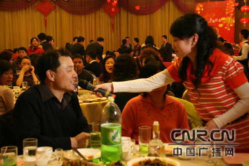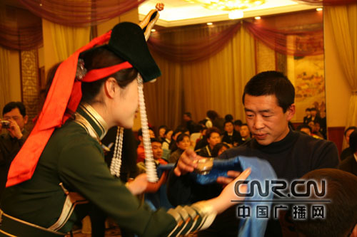 飯店工作人員用蒙古族最高禮向外來務(wù)工人員敬酒