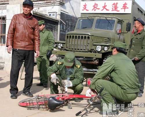 內蒙古軍區某部汽車團支農大篷車官兵正在幫助三卜樹村民修理農機具。(范德銀攝)