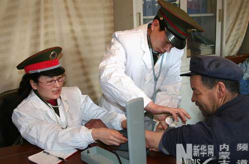 內蒙古軍區某部支農大篷車衛生員正在為呼和浩特市革命老區三卜樹村民體檢。(范德銀攝)