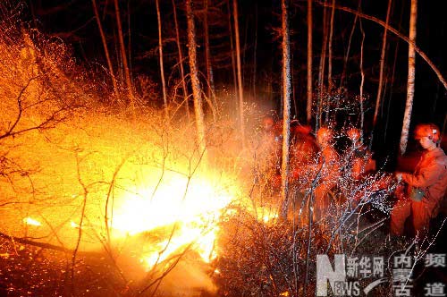 武警內蒙古大興安嶺森林支隊官兵在撲火前線(4月20日攝) 新華社記者張領攝