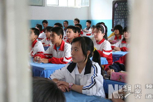 5月30日,在內蒙古包頭市第45中學初二(1)班的教室里,小果和同學們一起上課。包頭市第45中學決定免費接收小果在校就讀。新華社記者 周寧 攝