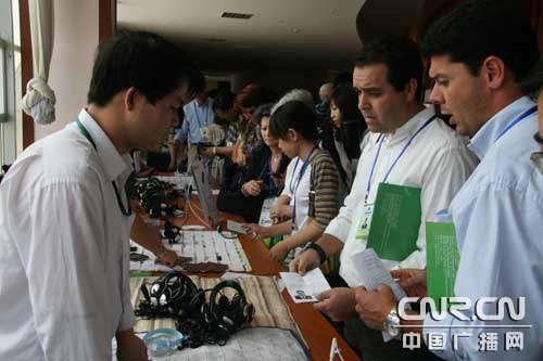 進(jìn)入會場前,與會人員領(lǐng)取翻譯耳機,并登記所需語言