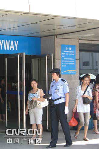 中廣網呼和浩特消息8月4日消息 (記者鄭穎 通訊員王金鐘 趙金智)8月4日,呼和浩特火車站,一名公安民警正在利用手中的危爆毒品探測儀對進站旅客進行奧運安檢。