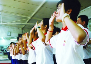 30張陽光般燦爛的笑臉,30雙有力的臂膀,30顆金子般的心靈,共同演繹《感恩的心》。“表情不夠自然,動作不夠統一。”指導老師康海琴對記者說。隨后,康海琴用手語將她的態度傳達給了30名聾啞學生。一遍又一遍,他們時而雙手環抱前胸,時而用手比劃成一個“心”,用心去詮釋這首歌曲。雖然不能說話,但他們齊刷刷地用手“舞”出這首歌曲時,是另外一種震撼。他們的節目將在火炬傳遞的終點進行演出。