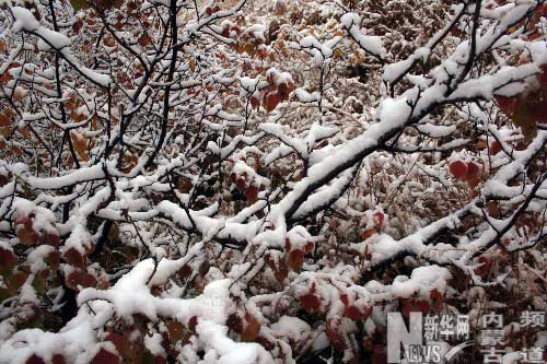 10月5日,在內(nèi)蒙古克什克騰旗,秋雪掛滿枝頭樹葉。 當(dāng)日,受冷空氣影響,內(nèi)蒙古克什克騰旗降下秋雪。 新華社發(fā)(孫國(guó)樹 攝)
