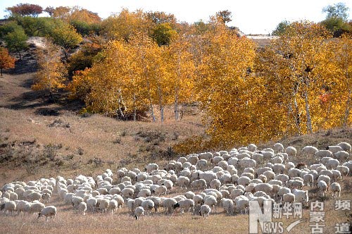 羊群在內蒙古克什克騰旗境內的林中吃草。 金秋時節,內蒙古草原進入牲畜出欄旺季。據內蒙古自治區農牧業廳夏季牧業普查結果顯示,2008年牧業年度,內蒙古自治區出欄牲畜達7264萬頭(只)。(張嶺)