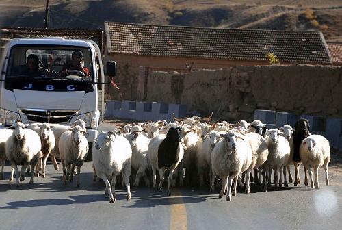 牧區經紀人駕車趕羊走在內蒙古克什克騰旗境內的公路上