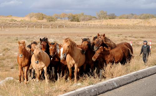 一名牧民趕馬走在內蒙古克什克騰旗境內的公路旁