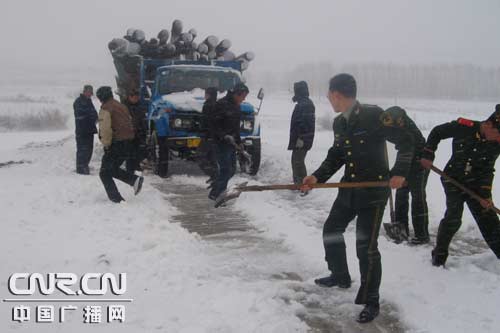 接此消息后,室韋邊檢站執勤官兵來不及添加任何防寒衣物就立即拿起清雪工具,迅速趕往車輛受困地點幫助清理道路積雪。由于積雪較厚且降雪一直未停,加之此段坡路較長,官兵在零下10攝氏度的低溫環境下,克服了手中工具簡易帶來的不便,發揚部隊不怕苦、不怕累的優良作風,堅持奮戰近兩個小時,將長約500米的道路徹底清理完畢,車輛得以繼續通行。司機張某緊緊握著執勤官兵的手,激動地說:“邊檢官兵在關鍵時刻總能挺身而出,為我們排憂解難,真不愧是人民的子弟兵,太謝謝你們了!”