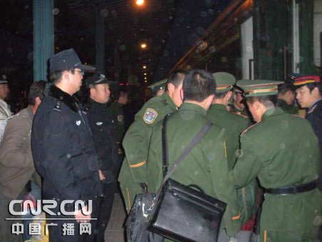 第一天老兵運(yùn)輸安全保衛(wèi)任務(wù),全處共出動(dòng)警力45人,警車5輛,使首日運(yùn)送的618名退伍老兵分乘5次列車順利返鄉(xiāng)。