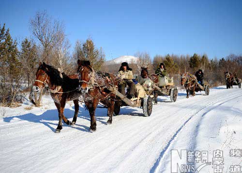 在呼倫貝爾烏奴爾林業(yè)局新林林場,幾位群眾趕著馬車上山(攝于12月1日)。 每年10月中下旬開始,內(nèi)蒙古自治區(qū)呼倫貝爾市就會出現(xiàn)千里冰封,萬里雪飄的景象。長達5個多月的冬季積雪期,讓這里的草原、森林、山川和河流展現(xiàn)出獨特的冰雪畫卷。 新華社記者 任軍川攝