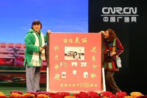 內蒙古著名笑星,國家一級演員武力平和他的女兒同臺演出的小品照相,用一個小小的照相機把農民和城里人聯系了起來,引來現場觀眾的陣陣笑聲。