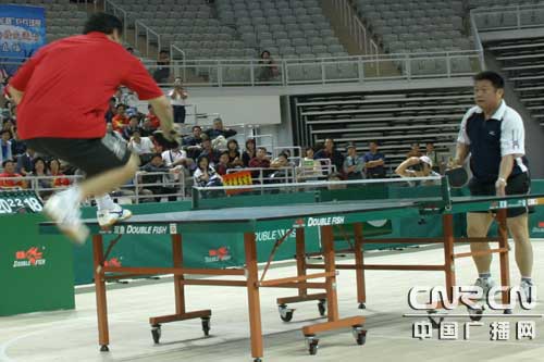 兩位前乒乓球世界冠軍郭躍華(右)和陳新華(左)進(jìn)行乒乓表演賽(攝影 王巖)