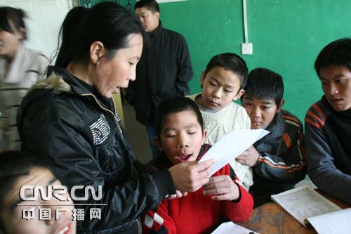 記者:要喊孫月光親媽媽的女孩叫邸春華,曾經是個聾啞兒童,在孫月光的精心輔導下,邸春華現在不僅能開口說話,還能對其他的聾啞兒進行康復訓練,成了自食其力的勞動者。孫月光創辦了內蒙古赤峰回音聾兒康復樂園,為了能隨時隨地的教孩子們發音,她把康復樂園辦到了自己家里。這個只有20平米的小屋,被孫月光隔成兩間,一間是只有七、八張小桌的教室,另一間是放著三張上下床和一張雙人床的臥室。孩子多,床位緊張時,孫月光就把兒子送給鄉下的婆婆照看,自己摟著聾兒睡覺。