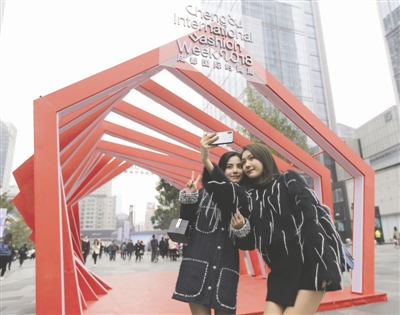時尚潮人在春熙路步行街成都國際時尚周的通道前拍照