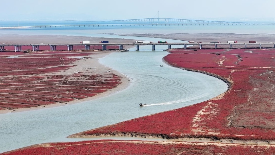10月29日,在青島西海岸新區紅石崖街道河海濕地,絳紅灘涂與蜿蜒潮溝構成絕美畫卷。