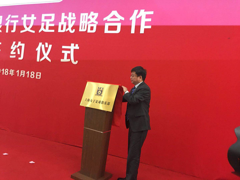 市政府副秘書長吳偕林向上海農商銀行黨委書記、董事長冀光恒授致謝牌。市體育局局長徐彬致辭,市足協主席朱廣滬介紹戰略合作情況。上海農商銀行行長徐力向上海女足主教練水慶霞授隊旗。