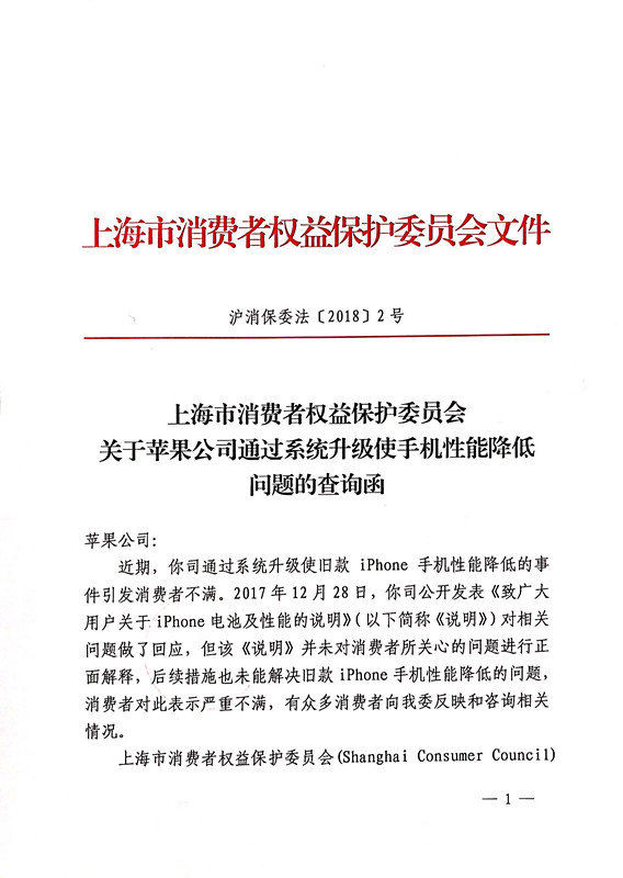 根據《查詢函》的要求,蘋果公司應于2018年1月19日前給予上海市消保委答復。