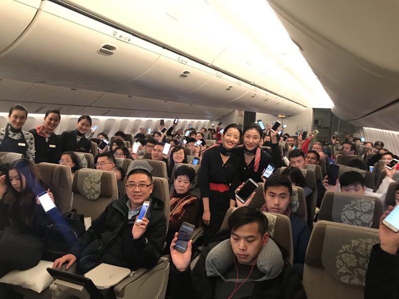 17日中午11:46起飛、18日凌晨1:48落地的MU587上海—紐約是全民航最早起飛的跨零點“空中開機”航班。意外聽到廣播的旅客們成功抓住了率先嘗鮮手機上網(wǎng)的“末班車”,而不少旅客已從其他移動設(shè)備提前獲悉了消息,早早地拿出手機等待開機。不少旅客還用“朋友圈”、“紅包”、直播等形式,分享喜悅、留下紀(jì)念。北京時間18日零點,東航共有181航班正在執(zhí)行之中,機上的旅客共同成為中國民航歷史上第一批在飛機上合規(guī)使用手機的人。
