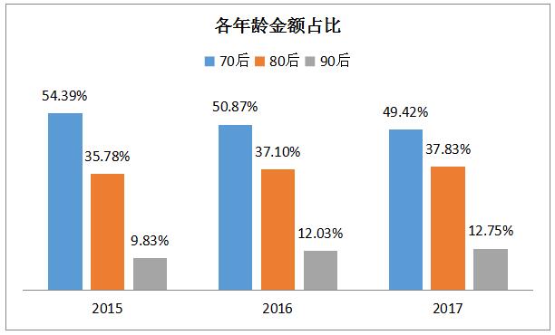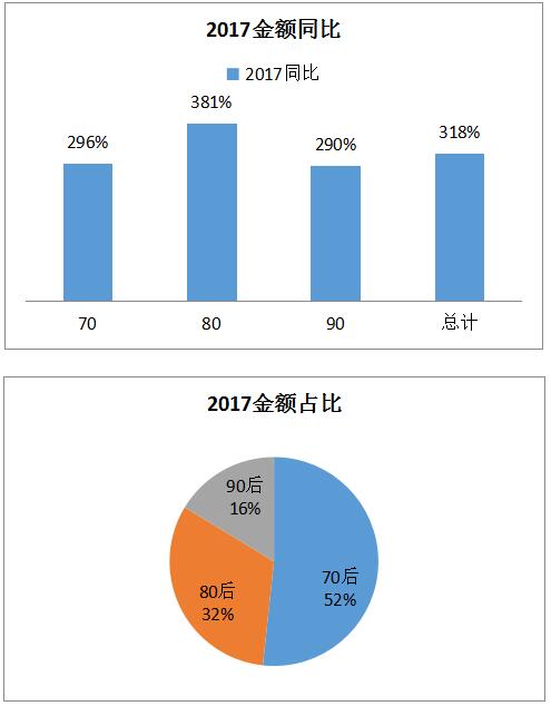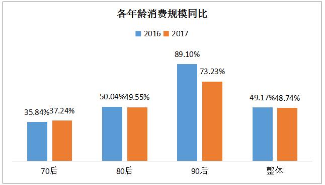 從消費(fèi)人群變化看,70后消費(fèi)貢獻(xiàn)當(dāng)仁不讓,80、90后正加快成長。2015年至2017年三年期間,70后始終作為消費(fèi)核心力量,貢獻(xiàn)了70、80、90后消費(fèi)整體規(guī)模的近一半。