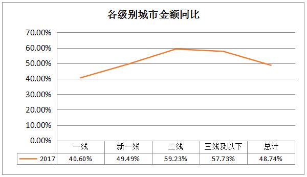 從消費(fèi)地區(qū)變化看,二三四線城市消費(fèi)快速崛起,增速超一線近1.5倍;粵、京、滬消費(fèi)貢獻(xiàn)全國前三;華中、東北、西北地區(qū)增速名列前茅。2017年,二線與三四線城市增速達(dá)59%、58%,增幅顯著高于一線及新一線城市,且增速優(yōu)勢不斷擴(kuò)大。
