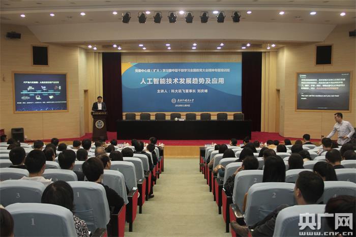 科大訊飛董事長劉慶峰在上海外國語大學為黨委中心組做“人工智能技術發展趨勢及應用”專題報告。(央廣網發 上海外國語大學 供圖)