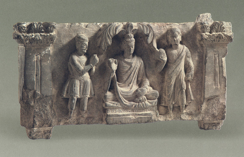 貴霜王朝時期,對于亞歷山大東征后留下的種種希臘羅馬藝術,對來自西邊的伊朗高原上的瑣羅亞斯德教、東南邊印度半島的印度教和佛教,都采取了兼收并蓄的包容態度,這極大豐富了貴霜時期的藝術表達方式。展覽中的“豐收女神坐像”是希臘藝術中常用到的素材,女神衣裙紋線流暢優美,右手上舉,左手于膝頭持握豐饒角(Cornucopia),表情慈祥。從此件雕塑中,可以看出希臘藝術在貴霜地區的深入影響。另一件展品“禮拜佛陀建筑構件”上的浮雕描述了菩薩、供養人共同聆聽釋迦牟尼說講佛法的場景,象征希臘建筑雕塑的科林斯柱頭與講經說法場景協調于一處。