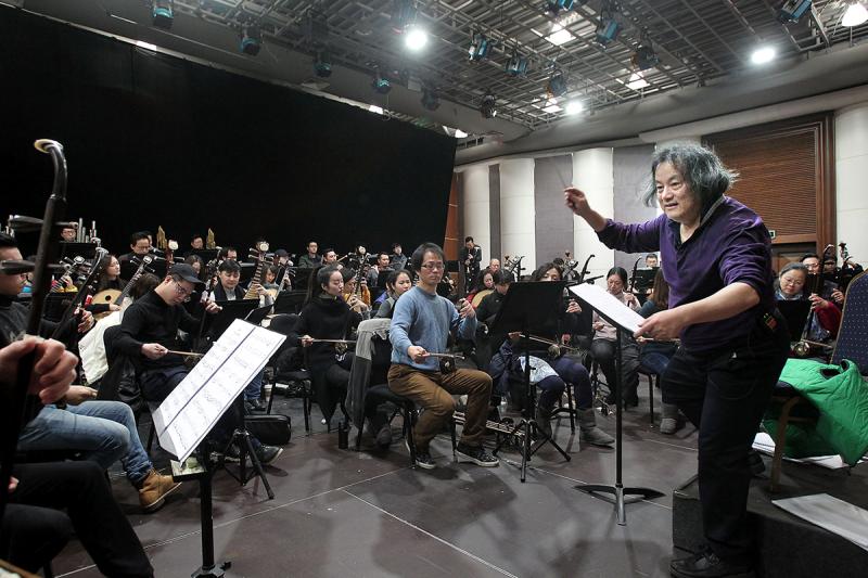 上海民族樂團在湯沐海指揮下進行歐洲巡演項目《海上生民樂》音樂會版排練。