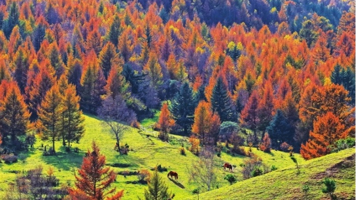 秋色正濃的山西省太原市婁煩縣云頂山,層林盡染,五彩斑斕,美景如畫。