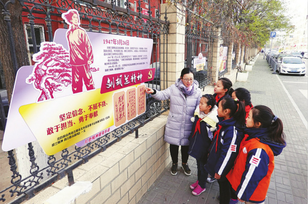 12月3日,社區志愿者正向太原市濱河小學的小學生講述“劉胡蘭精神”。為了提高社區文化氛圍,太原市迎澤區勁松社區在濱河小學附近的桃園南路西一巷,創建了百米長的“紅色精神”文化長廊。