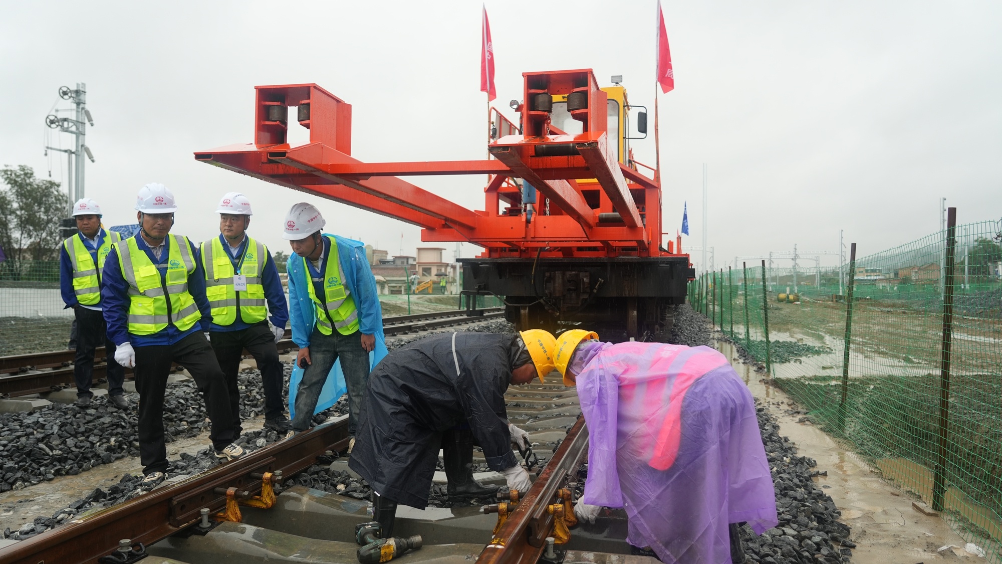 10月11日,陜西西安灞橋區的西康高鐵鋪軌基地內,我國自主研發的新型多功能長鋼軌牽引車徐徐前進,將首對500米長的鋼軌精準平穩地鋪設在無砟道床上。