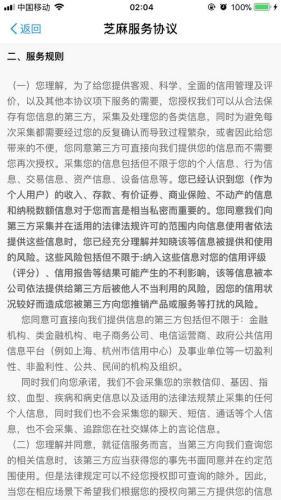 芝麻信用服務(wù)協(xié)議部分內(nèi)容截圖。