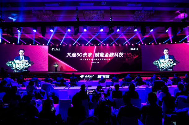 第三屆翼支付合作伙伴生態(tài)大會現(xiàn)場,中國電信集團(tuán)有限公司副總經(jīng)理王國權(quán)致辭。(翼支付供圖)