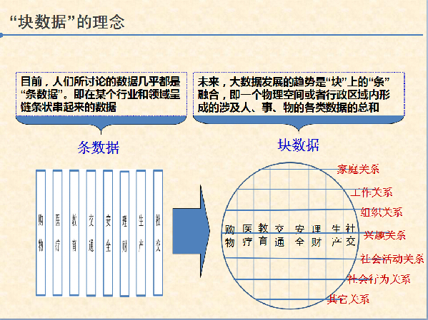 與之相比,塊數據是在一個物理空間或者行政區域形成的涉及到人、事、物等各類數據的綜合,相當于將各類“條數據”解構、交叉、融合。在塊數據集合過程中,包含了數據空間的填充、空間數據的重構、集合過程的組構,及組構過程中的集合,同時還有新數據的匯集和原有數據組合后的衍生數據。塊數據概念的提出和應用,使我們對大數據的挖掘實現了從混沌到精準。