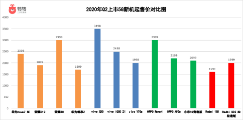 5G新機的價格也是一路下探。其中Redmi 10X更是將5G手機的官方起售價拉低到了1599元的水平。而在618大促期間,一些5G新機型的實際售賣價格更是下探到了1300元以內。