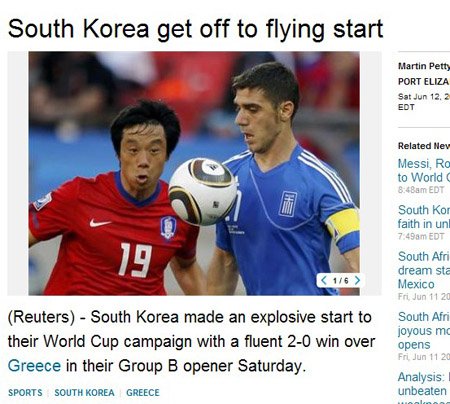 北京時間6月12日19點30分,在伊麗莎白港的曼德拉球場,韓國隊與希臘隊展開了世界杯小組賽B組首場比賽的角逐。韓國隊以2-0完勝希臘隊。路透社對于韓國隊李正秀和樸智星在本場比賽的表現,給予了很高的評價。