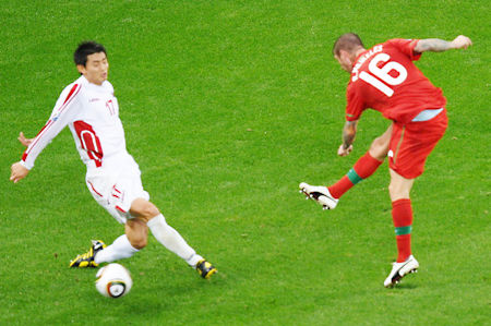 葡萄牙繼續排出433,不過人員組合上有很大變化,首場的三叉戟只保留了隊長C羅,老將西芒和高中鋒阿爾梅達得到首發機會。朝鮮首發和上場打巴西一模一樣。兩隊只在1966年世界杯1/4淘汰賽有過交鋒,那場朝鮮一度3-0領先但最后是3-5輸球被淘汰。
