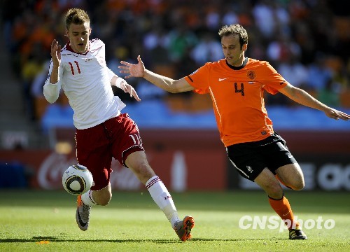 北京時間6月14日19:30(南非當地時間13:30),第19屆世界杯E組第一輪一場比賽在約翰內斯堡的足球城球場展開角逐,荷蘭2比0力克丹麥。第46分鐘,范佩西傳中,西蒙-鮑爾森頭球頂在阿格后背上折射破網,轉入自家大門,打出本屆世界杯第一記烏龍球。 中新社發 廖攀 攝
