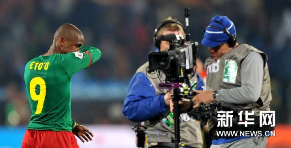 6月19日,喀麥隆隊球員埃托奧(左)在比賽結束后離場。當日,在茨瓦內舉行的2010南非世界杯E組第二輪比賽中,喀麥隆隊以1比2不敵丹麥隊,兩戰皆負的喀麥隆隊成為南非世界杯賽中首支出局的球隊。新華社記者楊磊攝