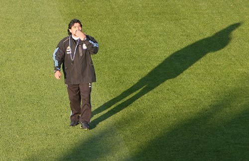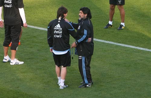 當(dāng)?shù)貢r間6日下午,馬拉多納率領(lǐng)的阿根廷隊在比勒托利亞大學(xué)Hatfield球場進行了公開訓(xùn)練。進場后,老馬架不住現(xiàn)場球迷的呼喊,兩度獻出飛吻。而在訓(xùn)練前,馬拉多納專門找到梅西,對他叮囑了幾句。